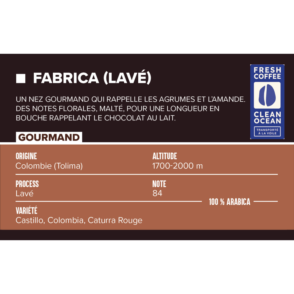 Ce lot Fabrica est issu de la région montagneuse du Tolima, en Colombie, entre 1700 et 2000 mètres d’altitude. Ce territoire, situé entre forêts et volcans, garantit un climat idéal pour la culture du café, avec des journées ensoleillées et des nuits plus fraîches qui ralentissent la maturation des cerises.