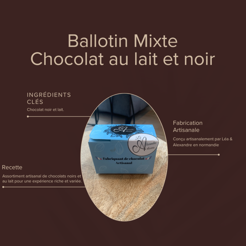 Ballotin Mixte 125 g Un coffret gourmand mêlant chocolat noir, lait et blanc, avec des inserts pralinés, gianduja et caramel. Une création artisanale pour des moments de plaisir intense.