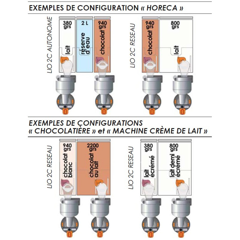 La machine à chocolat chaud Lio 2C est disponible en deux versions : la 2C AA, équipée d'un réservoir d'eau autonome de 2 litres, d'un bac à chocolat de 940 grammes et d'un bac à lait de 380 grammes. La version 2C AR de cette chocolatière électrique professionnelle est quant à elle raccordable sur le réseau d'eau, et dispose d'un réservoir de lait un peu plus grand (800 grammes).