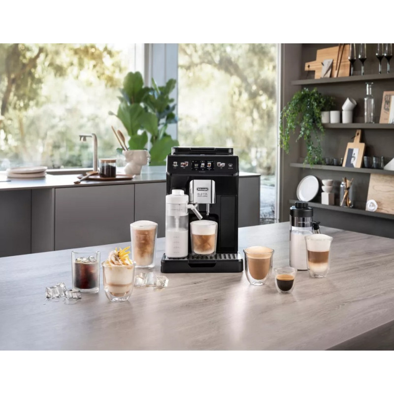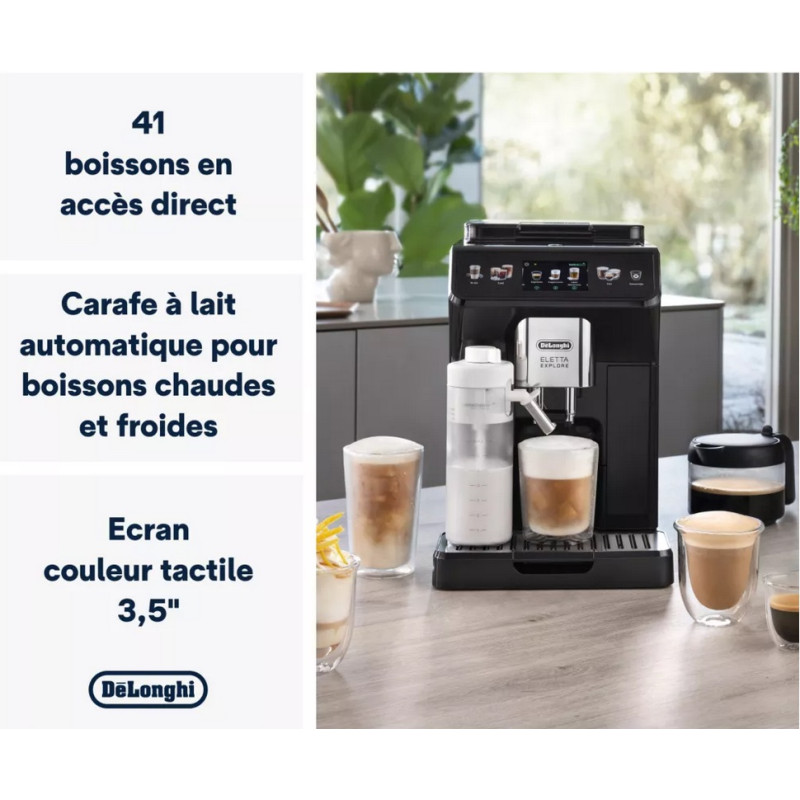 La carafe Latte Crema System "cold" est quant à elle dédiée aux boissons froides dites "Cold Brew"'. Idéalement, vous utiliserez du lait écrémé, pour une boisson plus digeste. Votre machine expresso broyeur Delonghi Eletta Explore est livrée avec un bac à glaçon, pour aider à réaliser les Cold Brew. Pendant toute la recette, la machine vous guide : quand mettre les glaçons, quel sélecteur de mousse de lait, etc. C'est très intuitif !