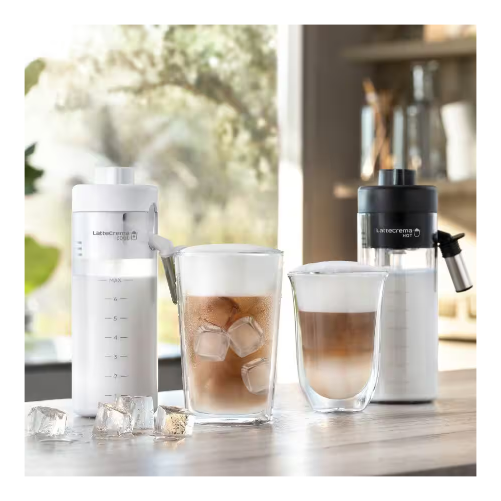La machine inclut deux carafes dédiées (chaud et froid), chacune équipée d’un système d’auto-nettoyage intégré. Il suffit d’appuyer sur une touche pour rincer la buse et la carafe. Le mousseur est compatible avec les laits végétaux : soja, avoine, amandes, etc.