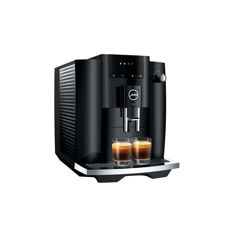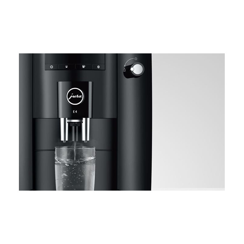 La Jura E4 est disponible en deux coloris : Piano White (blanc) ou Piano Black (noir). Le bac à égoutture, les buses de distribution de café et le bouton d'eau chaude sont chromés.