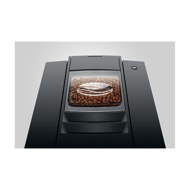 Cette cafetière Jura reprend son design reconnaissable facilement par sa façade légèrement arrondie et son aspect cubique. L'interface, très simple, permet de réaliser espresso et lungo, avec une possibilité de régler le grammage du café (intensité de 1 à 3 grains). Une trappe à café moulu permet d'utiliser de temps en temps du décaféiné.