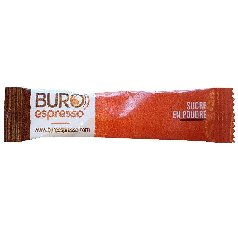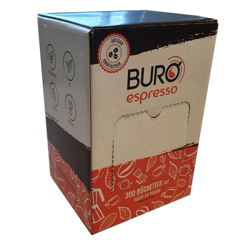 300 bûchettes de 4 grammes de sucre blanc issu de la betterave, labellisées Buroespresso.