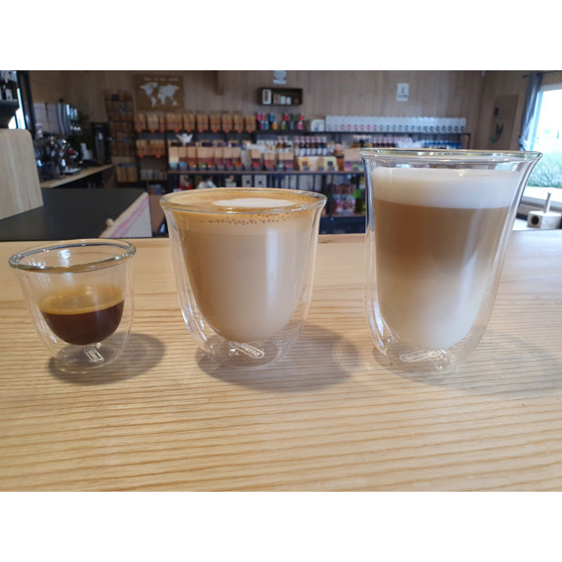 C'est trois tailles de verres double parois que nous vous proposons : 6cl pour les espresso (hauteur 6.5cm), 19cl pour les cappuccinos ou chocolats chauds (9.5cm) et 22cl pour les latte macchiato